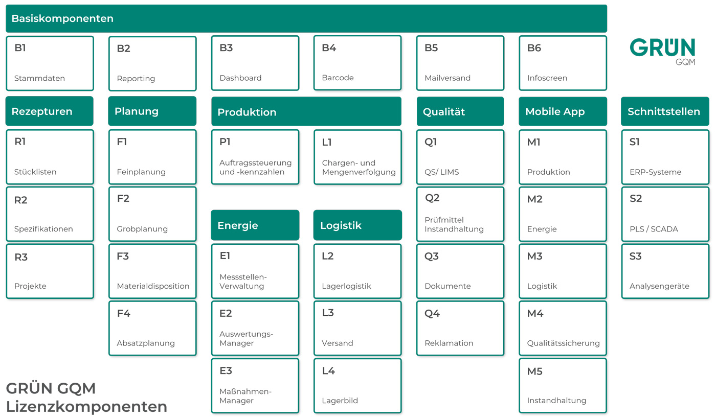 Als Branchenspezialist für die Lebensmittelindustrie und die Getränkeindustrie bietet die GRÜN GQM eine Know-how-basierte Manufacturing Execution System (MES) Software für den gesamten Bereich der Lebensmittel- und Getränkeindustrie einschließlich der entsprechenden Einführungsberatung zur flexiblen Anpassung an die jeweiligen Unternehmensanforderungen.